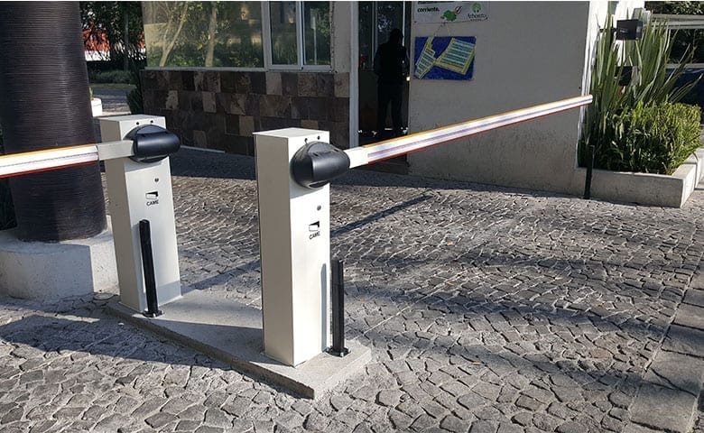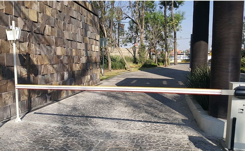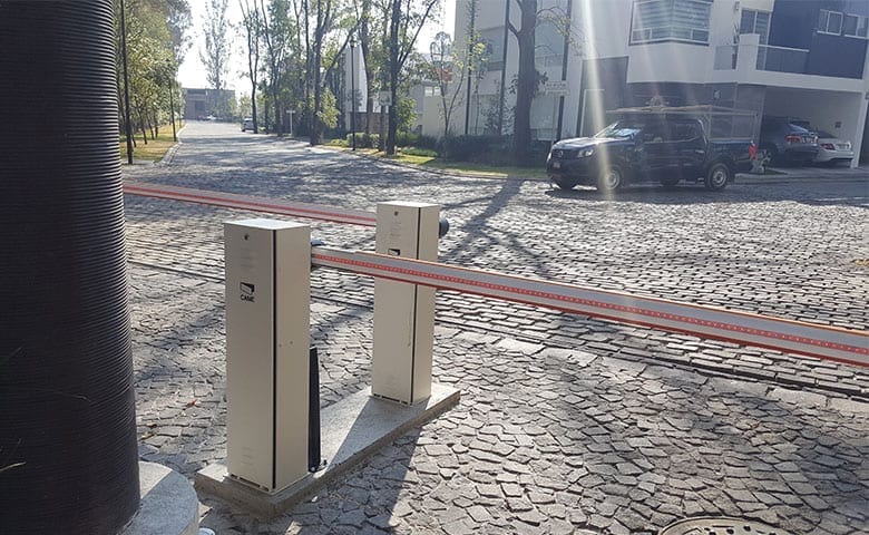 se instalaron barreras vehiculares 2 de visitantes y 2 residentes, tiene un servidor para registrar a los residentes y les permia la entrada y salida de manera autónoma mediante la lectura de tags instalados en los vehículos, las barreras de visitantes de controlan de manera manual con cierre automático ya que haya cruzado el vehículo.